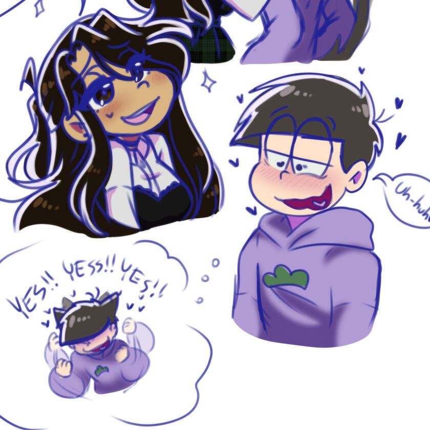 "He usually comes to my house a lot,, I did extend the offer to him! So its no biggie! He has a extra house key, but-- don't tell the others!! They'll kill him most likely if they found out, but thats exactly why he comes over. He sleeps over a lot when he had a bad day, though his companies really always appreciated ❤ We do self care together and I like to match outfits with him sometimes! Not in his fashion though I'm so sorry but,, no. Karamatsu is really sweet honestly, He cooks me lunch for work sometimes and tries to help me with housework, I really don't need him too but he always insists. He really means a lot to me, I appreciate lil blueberry so much! I'd consider him near a best friend! I don't think he sees me as that though so I normally just say Ichimatsu is."